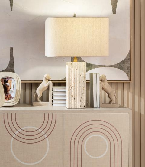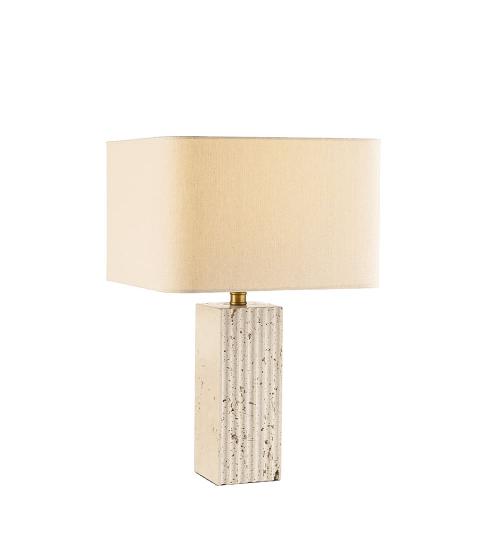 Stolová lampa z travertínu a kovu s ľanovým tienidlom. Elegantný textúrovaný efekt travertínu a kovové detaily robia z tejto lampy ústredný bod klasického a ikonického dizajnu.
